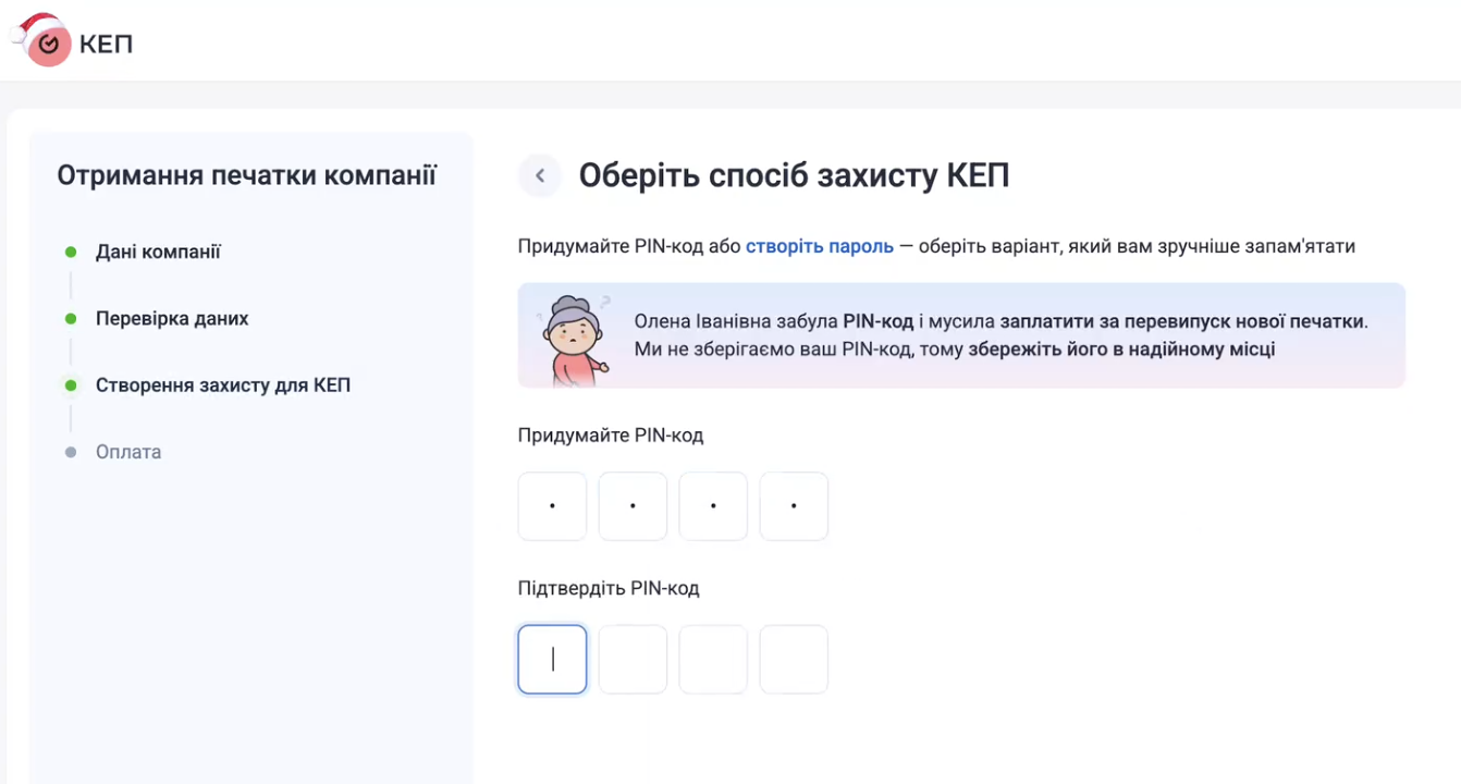 Далі потрібно придумати PIN-код (пароль) до ключа печатки та повторити його.